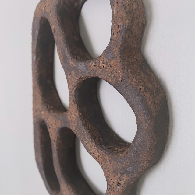 Käsityönä valmistettu keramiikkahylly. Hylly on valmistettu studiollani Vesannolla kivitavarasavesta. Päällä itse valmistamani tuhkalasite. Hyllyn takana reikä kiinnitystä varten.
