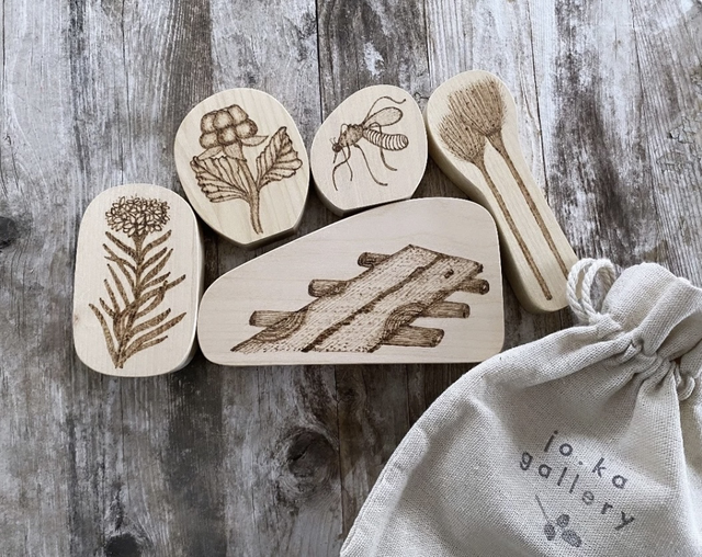 5 kaunista metsäaiheista palikkaa pellapussissa. Jokaisen palikan on käsityönä polttopiirtänyt Tiarella Moilanen Tampereella (@ohlalastudio). Puut ovat koivua meidän Pien Koskelan metsästä Vesannolta. Puupalikat ovat valmistettu verstaallani Vesannolla käsityönä aina puun kaadosta lähtien. Palikat ovat käsitelty mehiläisvahalla. Palikat voi pyyhkiä tarvittaessa kostealla liinalla. CE suositusikä +24 kk