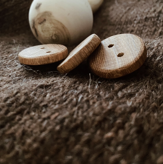 Käsityönä paikallisesta tammesta valmistetut napit. Halkaisija n. 2,5 cm. Setti sisäntää 4 nappia.